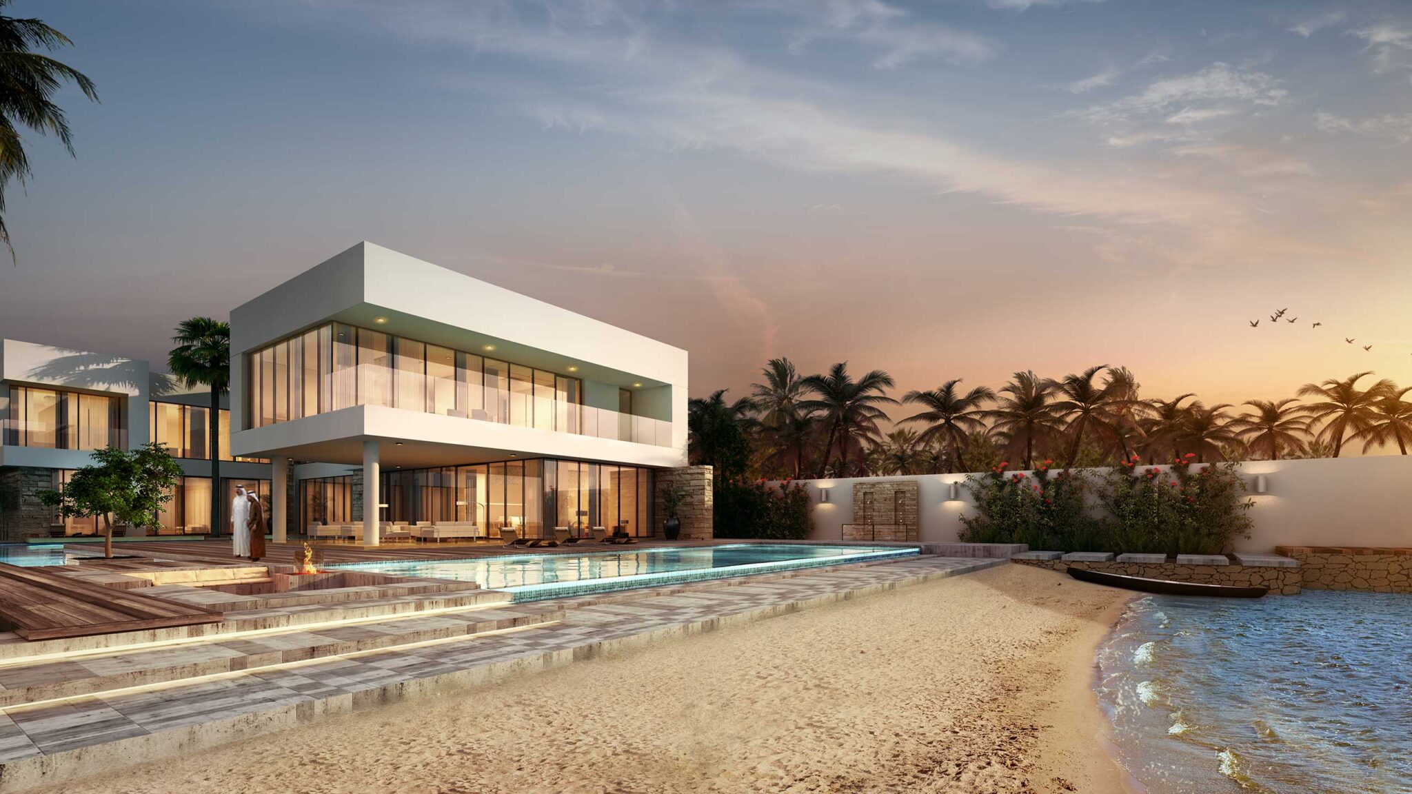 At the ground level, the formal zones are located near the entrance while the family zone is planned around a reflection pool that creates a private tranquil space and functions like a semi-enclosed courtyard. The family area is positioned nearest the beach front and represents the family value of the design. From the seaside, the villa’s contemporary architectural theme is manifested through the large glass openings and the “floating” first floor volume hovering above the ground level terrace.